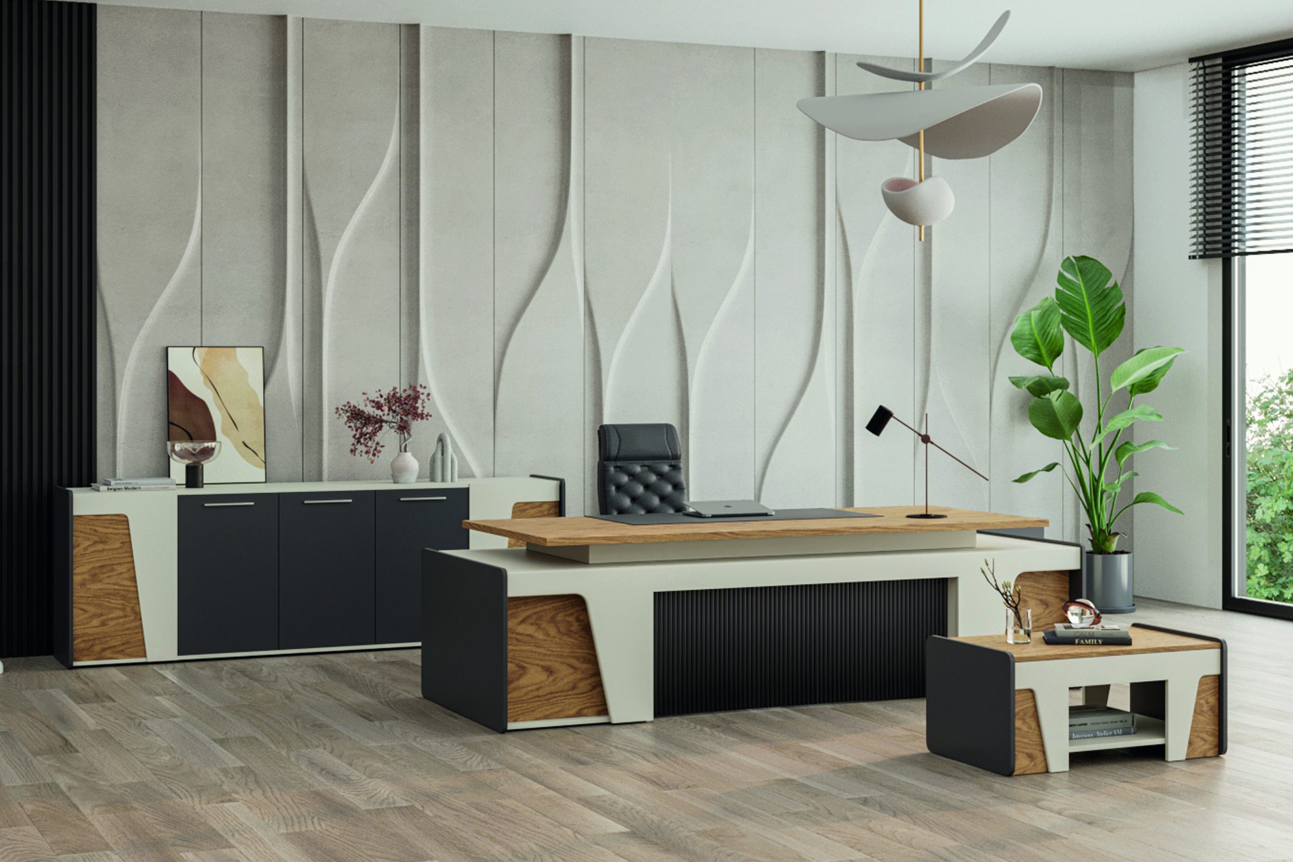 30 mm table chipboard thickness, CNC formed gofrato painted MDF parts (bookcase, table, etagere and coffetable), movable desk pad; fauix leather cladding on 2 mm metal sheet, self-closing telescopic rail, chipboard drawer chrome slim handle.